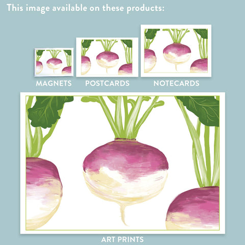 Juicy, delicate purple and white turnips! From a series celebrating the harvest of seasonal fruit and vegetable heirloom varieties. Our images cover winter, spring, summer, and fall. Perfect for chefs, cooks, kitchens, gardeners, restaurants, farms, orchards, botanical gardens, outdoor enthusiasts, nature, flower, and plant lovers, and art and print collectors. Pair this image with hundreds of Rigel's colorful and uplifting bird and botanic drawings. Features original artwork of botanical/nature/bird printmaker and illustrator Rigel Stuhmiller. Products are designed and locally crafted in California, with an eco-friendly commitment to environmental sustainability. A significant portion of our product line is crafted from recycled materials or responsibly sourced resources aiming to reduce carbon footprint.